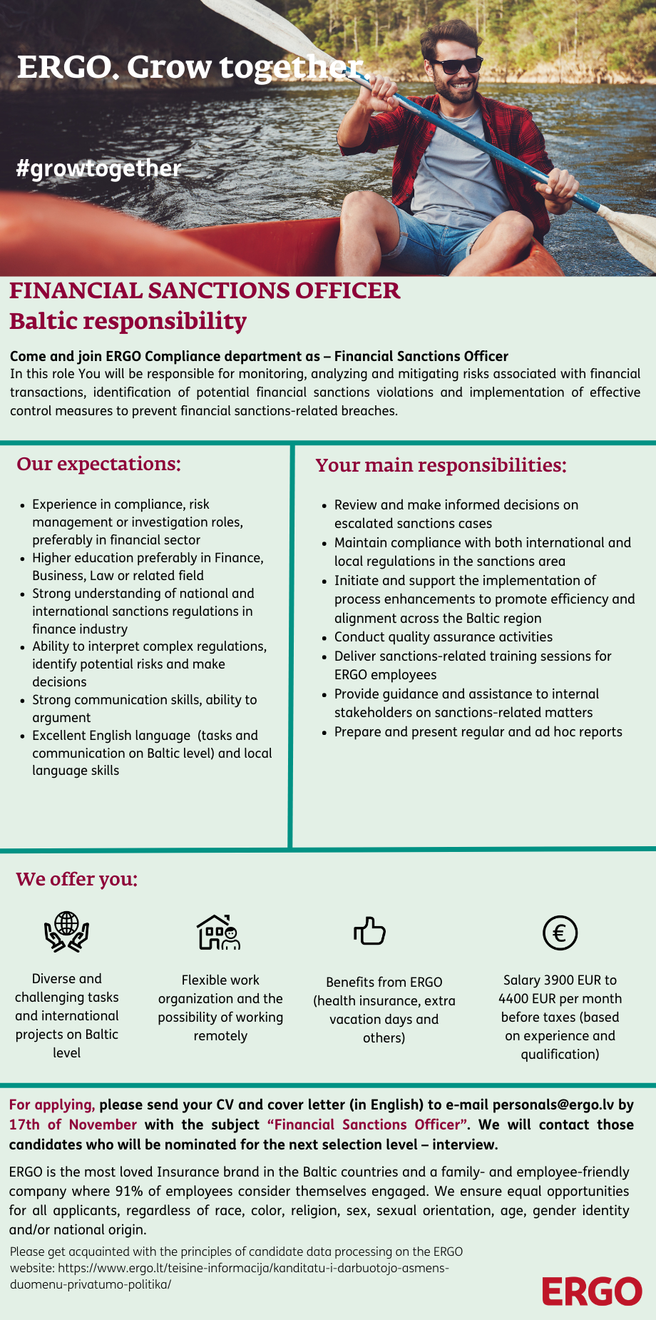 ERGO tai beveik 800 žmonių bendruomenė Lietuvoje. Ir mes visi kartu rūpinamės savo klientais, kaip padėti jiems ir jų artimiesiems, jei nutinka nelaimė. Mes kartu su savo bičiuliais SOS vaikų kaimu, Kino pavasariu, Klaipėdos universiteto Jūrų tyrimu centru taip pat rūpinamės, kaip sukurti gražesnę ir švaresnę Lietuvą. Esame socialiai atsakingi ir remiame daugelį projektų ir patys aktyviai juose dalyvaujame.